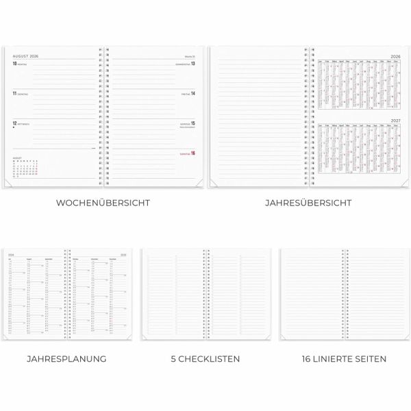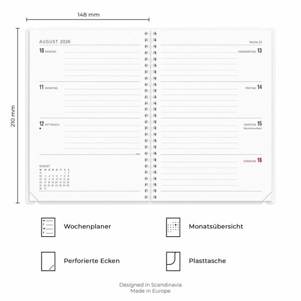 Die Vorderseite kannst du das ganze Jahr über ändern, der Kalender enthält vier Motive, die du leicht austauschen kannst, oder warum nicht ein eigenes erstellen? Damit dies möglich ist und weiterhin ein praktisches Cover bleibt, ist das Cover aus Kunststoff gefertigt. Ein Layout, bei dem der Fokus auf klarer Planung liegt. Der Innenteil passt zu dir, wenn du viel zu tun hast, unabhängig vom Wochentag. Der Kalender ist einfach und übersichtlich, mit gleich viel Platz für sowohl Wochentage als auch Wochenenden. Format: A5. Abmessung: 218 x 160 x 16 mm. Layout: Woche/2-Seiten. Horizontal. Kalendarium: 2025-12-08 - 2027-01-03. Einband: PP-Kunststoff. Spiralgebunden. Einzelheiten: Elastisch. Inhalt: Jahresübersicht, Checklisten, Jahrespläne. Seitenzahl: 144. Umweltinformationen: FSC®.