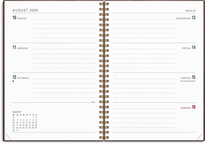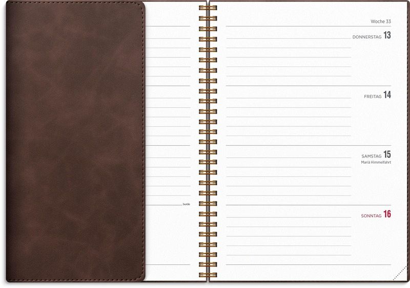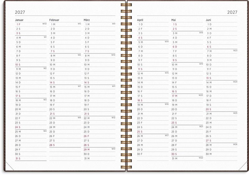 Senator A5 bietet ein klassisches Layout im horizontalen Format, das sich auf eine einfache Wochenplanung konzentriert. Mit einer übersichtlichen Wochenplanung, Jahresübersicht und Monatsplanung ist der Senator A5 ein ideales Werkzeug für dich, wenn du viel auf dem Programm hast oder als analoges Ergänzungsmittel zu deinen digitalen Lösungen. Zusätzlich enthält er Checklisten, kleinere Notizmöglichkeiten und eine praktische Aufbewahrungstasche. Er ist auch in einem kompakteren A6-Format erhältlich. Das Cover Twist besteht aus samtweichem Kunstleder und verfügt über eine nützliche Lasche, die als Lesezeichen dient, um dich einfach durch die Kalenderseiten zu navigieren. Format: A5. Abmessung: 214 x 163 x 16 mm. Layout: Woche/2-Seiten. Horizontal. Kalendarium: 2025-12-08 - 2027-01-03. Einband: Kunstleder. Spiralgebunden. Inhalt: Jahresübersicht, Checklisten, Jahrespläne. Seitenzahl: 144. Umweltinformationen: FSC®-Papier.