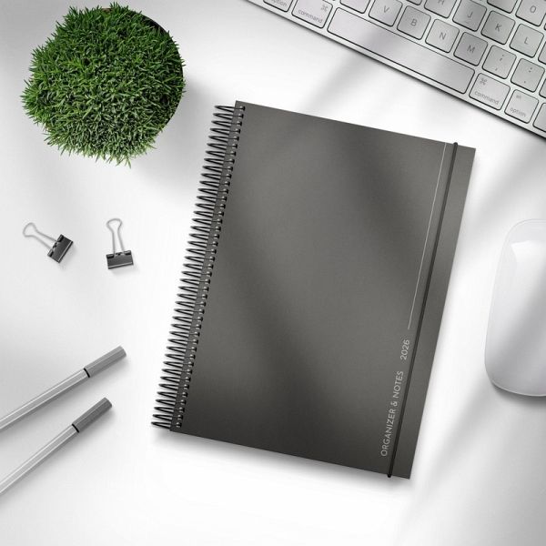 Ein Kalender und Notizbuch in einem! Die erste Hälfte enthält ein Kalendarium mit einer horizontalen Wochenübersicht, während die zweite Hälfte linierte Seiten für deine Listen und Notizen bietet. Mit den verschiebbaren Tabs kannst du bequem zwischen Wochenplanung und Notizen wechseln. Mit einem Bezug aus strukturiertem schwarzem Karton wird der Organizer & Notes zu einem treuen und stilvollen Begleiter bei Meetings und im Alltag. Format: A5. Abmessung: 213 x 173 x 26 mm. Layout: Woche/2-Seiten. Horizontal. Kalendarium: 2025-12-08 - 2027-01-03. Einband: Karton mit Struktur. Spiralgebunden. Einzelheiten: Elastisch. Bewegliche Plastikregisterkarten. Inhalt: Jahresübersichten, Linierte Notizseiten, Jahrespläne. Seitenzahl: 266. Umweltinformationen: FSC®.