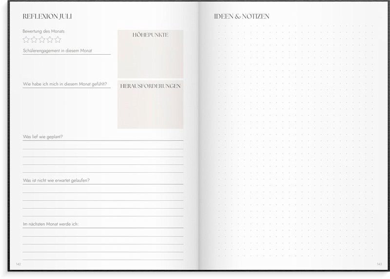 Ein Kalender für Lehrkräfte, die neben der Zeitplanung auch ihr Wohlbefinden in den Vordergrund stellen möchten. Der Kalender enthält Module für die Unterrichtsplanung, Ergebnisdokumentationen für Lehrkräfte und Schüler, Platz für Reflexionen und Zielverfolgung. Der Fokus liegt auf Erkenntnissen über das Lernen und darauf, wie man durch effektive Planung, Reflexion und Nachverfolgung Wohlbefinden und weniger Stress schaffen kann. Der Kalender ist für alle Jahrgangsstufen geeignet, von der ersten Klasse bis zum Gymnasium. Er enthält eine jährliche Übersicht mit Zielen, eine Monatsübersicht, Wochenübersichten mit viel Platz für Planung, Höhepunkte, reflektierende Fragen, Testergebnisse, Klassenlisten, Urlaubsplanung und mehr. Bleiben Sie motiviert, fokussiert und holen Sie das Beste aus Ihrem Beruf als Lehrkraft heraus, wobei Ihr eigenes Wohlbefinden im Mittelpunkt steht.