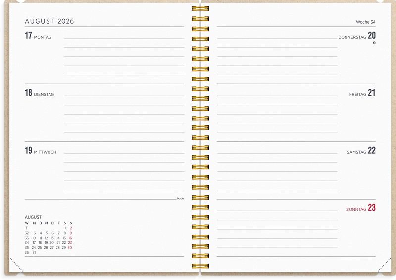 Strukturieren Sie Ihren Tag, organisieren Sie Ihr Leben, planen Sie Ihren Erfolg und leben Sie Ihr Leben in vollen Zügen. Schaffen Sie Platz für Ihre wichtigsten Aufgaben, die Schule, die Arbeit und Ihre Verpflichtungen, und planen Sie zwischendurch Zeit ein, um innezuhalten, über Ihr Leben nachzudenken und Zeit mit Dingen zu verbringen, die Ihnen Energie geben. Dieser Wochenkalender hilft, den Tag zu organisieren und die Zeit sinnvoll einzuteilen, sich auf Prüfungen vorzubereiten, an eine Party zu denken und Ziele für sich selbst zu setzen. Einzelheiten: Format: A5 Layout: Horizontal Kalendarium: 2025-07-28 bis 2026-08-23 Umschlag: Strukturierter Karton Bindung: Silberne Wire-O-Bindung Papier: 90 g FSC-Papier Weitere Merkmale: Perforierte Ecken, Papiereinstecktasche Inhalt: 3 Seiten zur Erstellung des Wochenplans für die Schule. Jahresübersichten, für Ihre langfristige Planung. Ihre Jahresplanung, mit Platz für Ihre Kurznotizen für das kommende Jahr. Horizontales Layout, mit einer Woche pro Seite. Praktische Linien zum Beschreiben, Planen und Organisieren Ihres Lebens. Auf dem Wochenlayout gibt es auch Platz für "andere Notizen", z. B. für Erinnerungen, Einkaufen oder Überlegungen während der Woche. So können Sie Ihre Woche und die kommenden Wochen auf einfachste Weise planen und haben einen kleinen Überblick über den Monat. Offizielle Feiertage für Deutschland, Österreich und die Schweiz. Jahresplan für das kommende Jahr. Zum Abschluss gibt es 8 Seiten mit To-Do-Listen. 15 Seiten mit Zeilen für Ihre Gedanken, Überlegungen und Pläne.