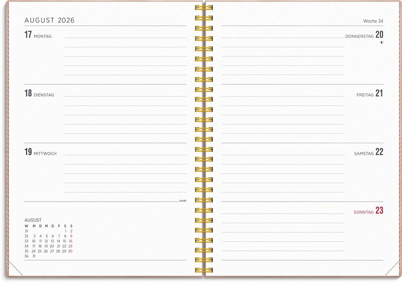 Strukturieren Sie Ihren Tag, organisieren Sie Ihr Leben, planen Sie Ihren Erfolg und leben Sie Ihr Leben in vollen Zügen. Schaffen Sie Platz für Ihre wichtigsten Aufgaben, die Schule, die Arbeit und Ihre Verpflichtungen, und planen Sie zwischendurch Zeit ein, um innezuhalten, über Ihr Leben nachzudenken und Zeit mit Dingen zu verbringen, die Ihnen Energie geben. Dieser Wochenkalender hilft, den Tag zu organisieren und die Zeit sinnvoll einzuteilen, sich auf Prüfungen vorzubereiten, an eine Party zu denken und Ziele für sich selbst zu setzen. Der Kalender Twist hat einen weichen Kunstlederbezug mit der beliebten Klappe, die man als Lesezeichen verwenden kann. Einzelheiten: Format: A5 Layout: Horizontal Kalendarium: 2025-07-28 bis 2026-08-23 Umschlag: Kunsleder mit Folienprägung Bindung: Goldene wire-o Papier: 90 g FSC-Papier Weitere Merkmale: Perforierte Ecken, Papiereinstecktasche. Inhalt: 3 Seiten zur Erstellung des Wochenplans für die Schule. Jahresübersichten, für Ihre langfristige Planung. Ihre Jahresplanung, mit Platz für Ihre Kurznotizen für das kommende Jahr. Horizontales Layout, mit einer Woche pro Seite. Praktische Linien zum Beschreiben, Planen und Organisieren Ihres Lebens. Auf dem Wochenlayout gibt es auch Platz für "andere Notizen", z. B. für Erinnerungen, Einkaufen oder Überlegungen während der Woche. So können Sie Ihre Woche und die kommenden Wochen auf einfachste Weise planen und haben einen kleinen Überblick über den Monat. Offizielle Feiertage für Deutschland, Österreich und die Schweiz. Jahresplan für das kommende Jahr. Zum Abschluss gibt es 8 Seiten mit To-Do-Listen. 15 Seiten mit Zeilen für Ihre Gedanken, Überlegungen und Pläne.