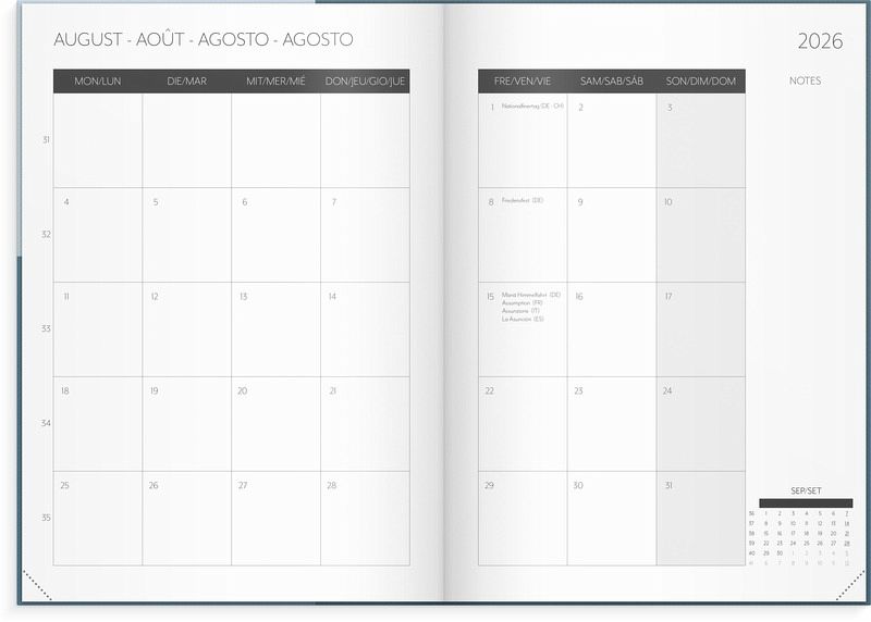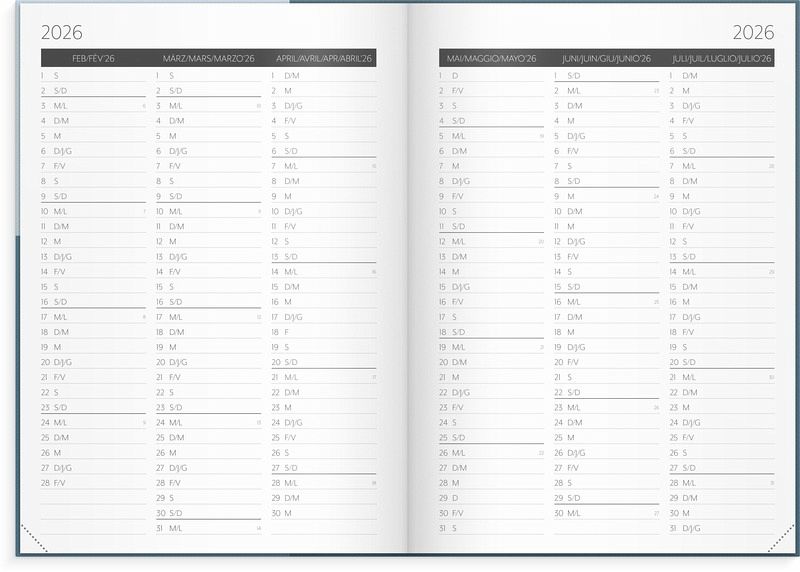 Das Leben als Student zu planen, ist nicht immer einfach, denn es gibt immer eine Menge Dinge, die man im Auge behalten, planen und lernen muss. Schaffe Raum für das Lernen und Studieren, finde Zeit, um wieder Energie zu tanken und die Batterien aufzuladen. Ein paar Momente, um zusätzliche Arbeit zu erledigen. Momente, um die Leistungen und Erfolge zu feiern. Mit den Stundenplänen am Anfang des Kalenders hat man die Möglichkeit, die Fächer leicht im Auge zu behalten, und mit dem Wochenkalender kann man den Überblick behalten und den Plan für den Tag verwalten. Setze Ziele und Zukunftswünsche, indem man eine Traumreise für die Zukunft plant und die Orte markiert, die man bisher im Leben besucht hat. Feier Erfolge und verfolge die Fortschritte in der Ausbildung, indem man die Testergebnisse am Ende des Kalenders notiert und stolz darauf sein kann, wie weit man schon gekommen ist. Einzelheiten: Format: A5 Layout: Vertikal Umschlag: Strukturierter Karton Bindung: Gebunden Papier: 90g FSC-Papier Andere Eigenschaften: Gummiband, 1 Lineal/Lesezeichen Inhalt: Jahresübersichten, Monatsübersichten und Monatsnotizen, wichtige Termine, monatliche To-Dos, Seite zur Nachbereitung der Testergebnisse, Weltkarte. Der Kalender ist viersprachig (Deutsch, Französisch, Spanisch und Italienisch).