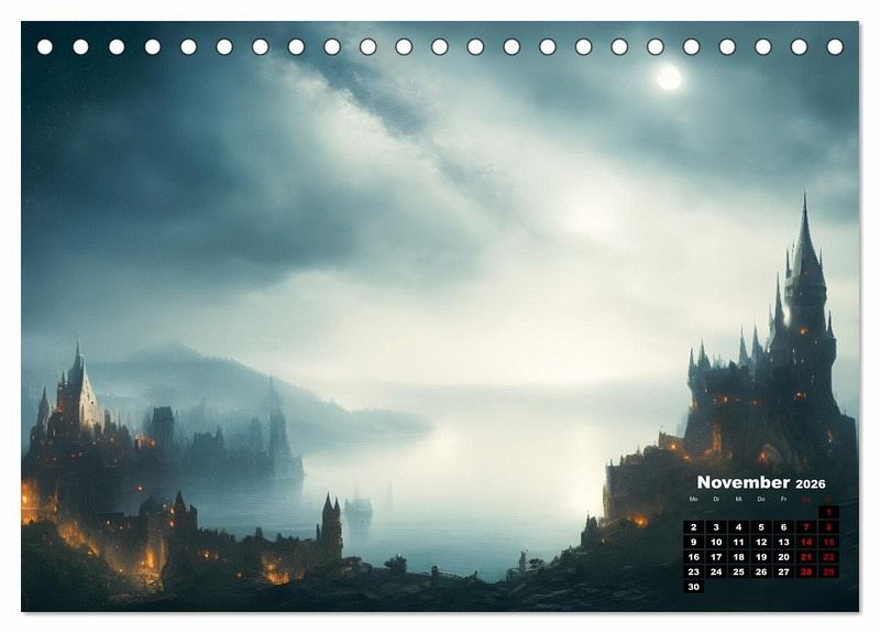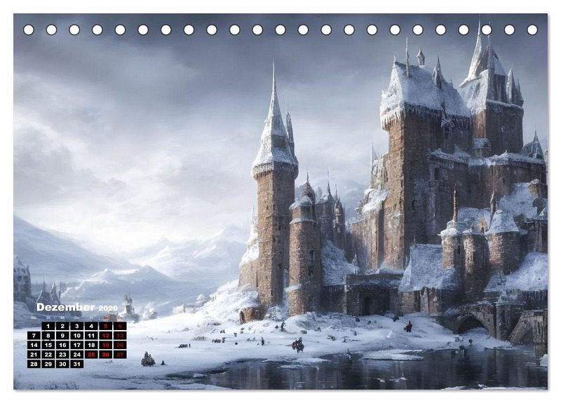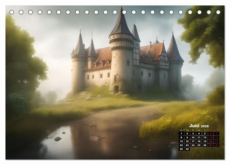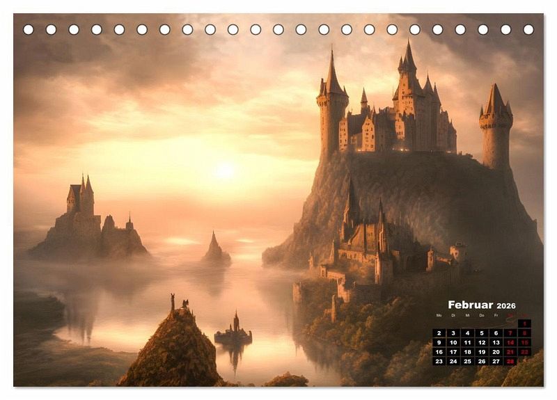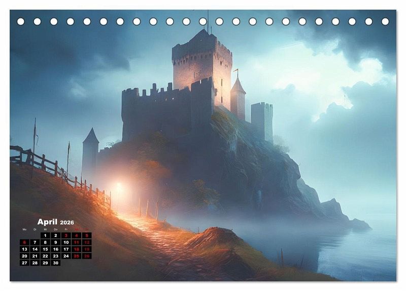 Tauche ein in eine zauberhafte Welt vergangener Epochen. Dieser einzigartige Kalender präsentiert mittelalterliche Burgen in mystisch verwunschenen Landschaften und entführt in eine magische Reise durch die Zeit. Erlebe die majestätische Schönheit und die geheimnisvolle Atmosphäre dieser verwunschenen Türme und imposanten Festungen, die von KI-Phantasie geschaffen wurden.
