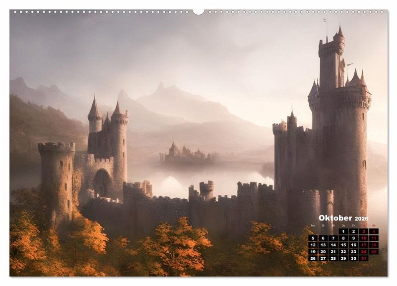 Tauche ein in eine zauberhafte Welt vergangener Epochen. Dieser einzigartige Kalender präsentiert mittelalterliche Burgen in mystisch verwunschenen Landschaften und entführt in eine magische Reise durch die Zeit. Erlebe die majestätische Schönheit und die geheimnisvolle Atmosphäre dieser verwunschenen Türme und imposanten Festungen, die von KI-Phantasie geschaffen wurden.