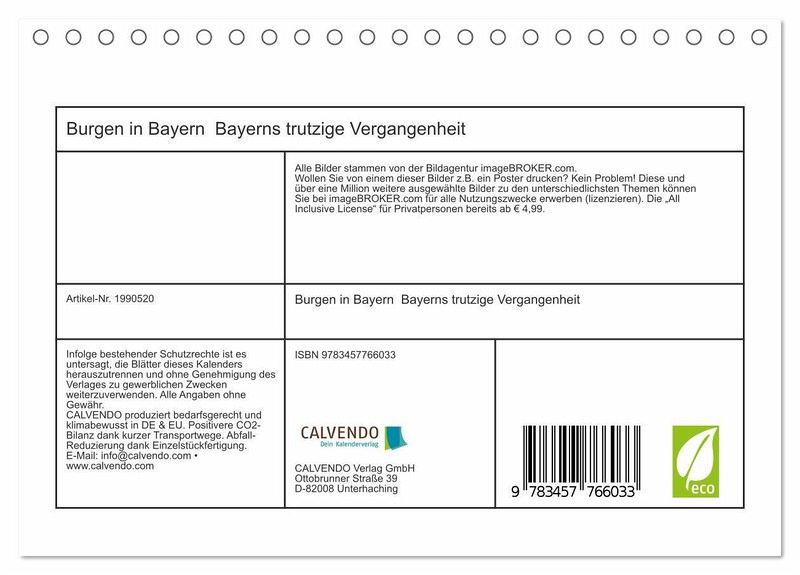 Die in diesem Kalender dargestellten zwölf Burgen können nur stellvertretend für die Vielzahl der bayerischen Burgen stehen. Sie zeugen von der der Baukunst des Mittelalters in Bayern.