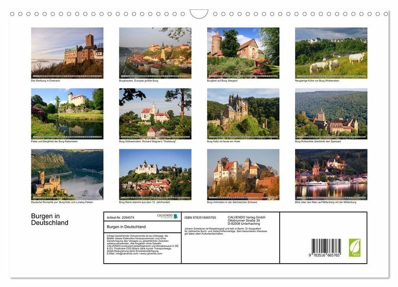 QUALITÄT - Hochwertiger Fotokalender mit 12 wunderschönen Motiven auf lichtbeständigem Bilderdruckpapier, robuste Spiralbindung mit Aufhängebügel.NACHHALTIG - deutliche Abfallreduzierung durch bedarfsgerechte Einzelstückfertigung, umweltfreundliches FSC-zertifiziertes Papier, Produktion in Deutschland, klimabewusste Logistik.PERFEKTES GESCHENK - Kalender für Freunde und Familie, für Kinder und Erwachsene, jung und alt, zu Weihnachten, Geburtstag oder zwischendurch.VIELFALT - Bildkalender in verschiedenen Formaten, z.B. DIN A5, DIN A4, DIN A3 sowie DIN A2. Ob Naturmotiv, Gemälde oder Fotos, ideal für ein persönliches Wohlfühlambiente.Der Berliner Reisefotograf Johann Scheibner stellt einige romantische, mittelalterliche Burgen vor. von Autor(in): Johann Scheibner