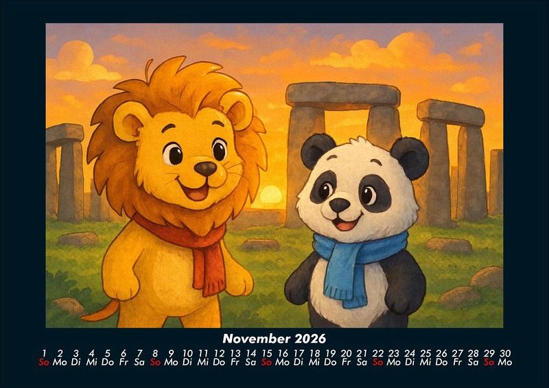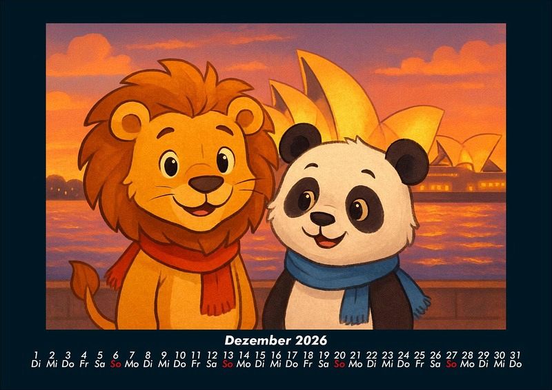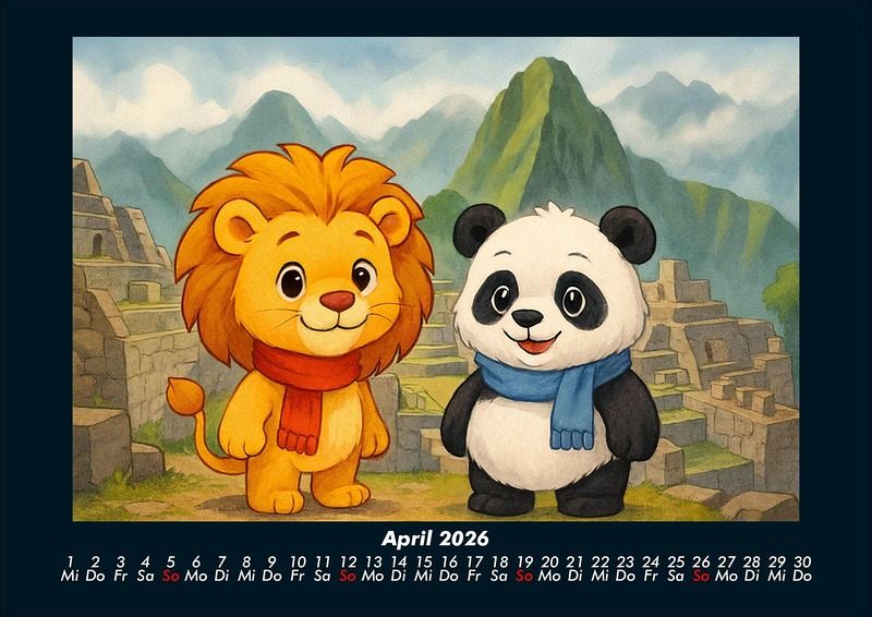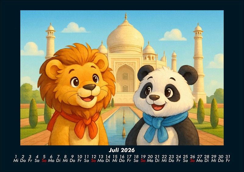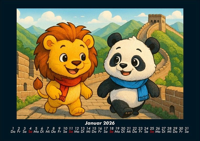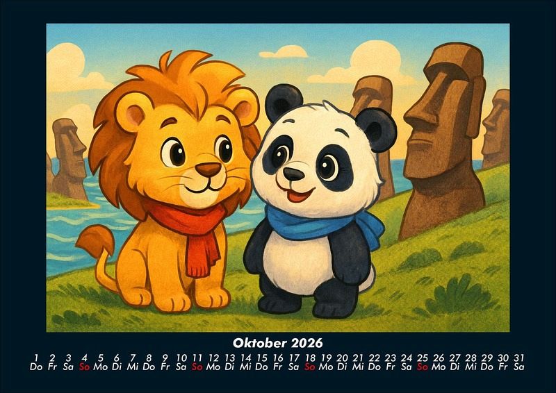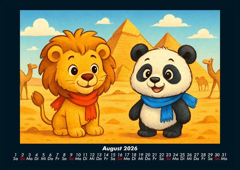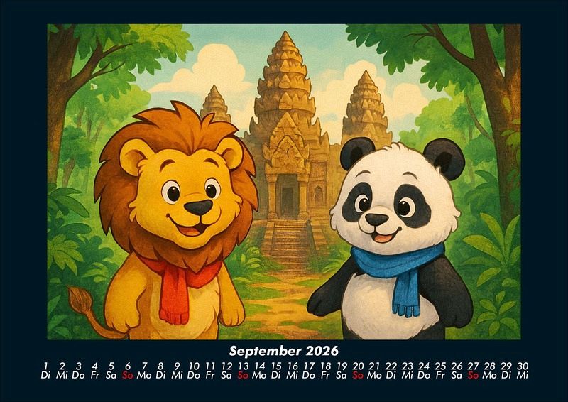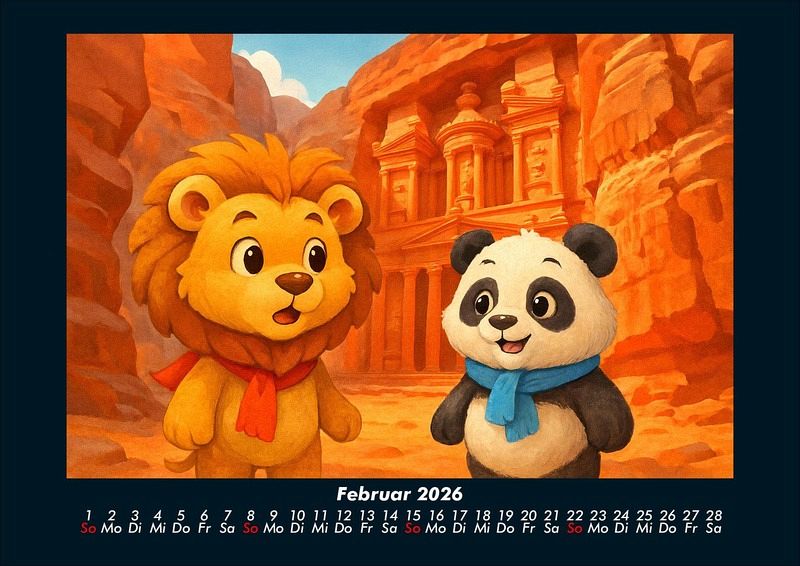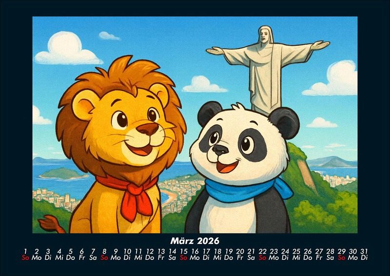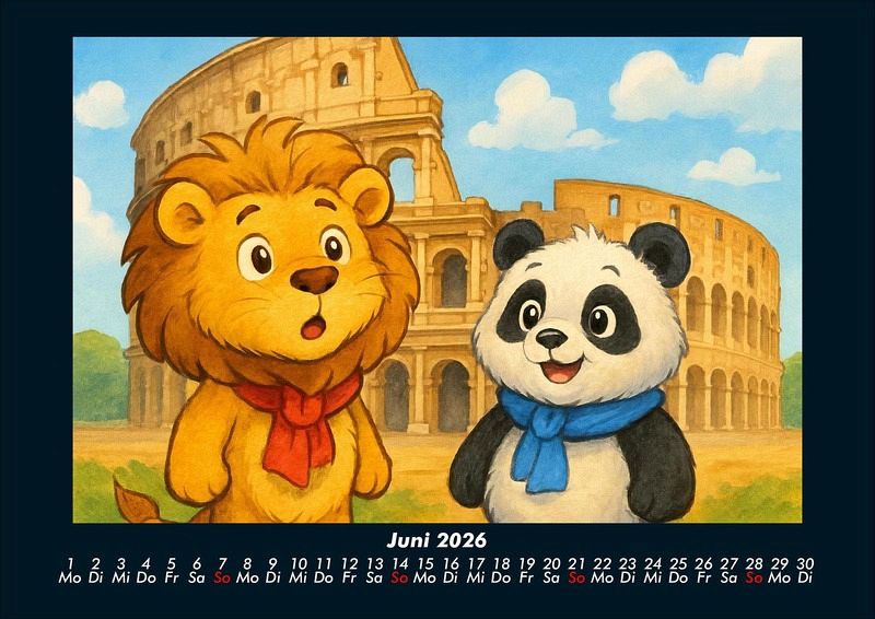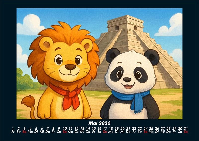 Buschi und Pippin - Reise zu den Weltwundern 2026 Motivkalender DIN A4 Buschi der verspielte Löwe und Pippin der fröhliche Panda erkunden die faszinierenden Weltwunder. Jeden Monat entdecken sie gemeinsam beeindruckende Orte - von den Pyramiden in Ägypten bis zur Chinesischen Mauer, vom Taj Mahal bis Machu Picchu. Ein farbenfroher Kalender voller Abenteuer, Freundschaft und Staunen über die Wunder dieser Welt. Vero-Kalender Kids zeigen liebevoll gestaltete Monatskalender mit bunten Bild-Motiven tierischer Freunde, die gemeinsam spannende Abenteuer erleben und die Welt entdecken. Ob in fernen Ländern, zwischen berühmten Sehenswürdigkeiten oder in magischen Landschaften - die fröhlichen Tiercharaktere begleiten Kinder Monat für Monat durch ein Jahr voller Fantasie, Freude und Freundschaft. Gedruckt werden die Kinder-Kalender aus dem Vero Verlag auf hochwertigem Kalenderbogen in Premium-Qualität und in verschiedenen Größen.