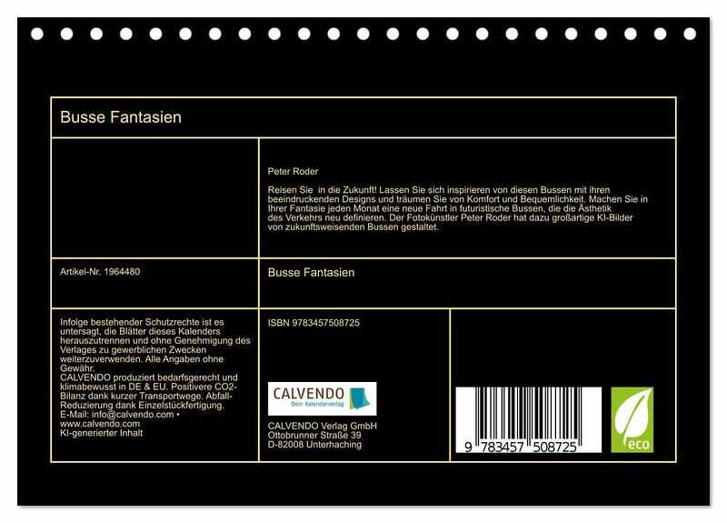 QUALITÄT - Hochwertiger Fotokalender mit 12 wunderschönen Motiven auf lichtbeständigem Bilderdruckpapier, robuste Spiralbindung.NACHHALTIG - deutliche Abfallreduzierung durch bedarfsgerechte Einzelstückfertigung, umweltfreundliches FSC-zertifiziertes Papier, Produktion in Deutschland, klimabewusste Logistik.PERFEKTES GESCHENK - Kalender für Freunde und Familie, für Kinder und Erwachsene, jung und alt, zu Weihnachten, Geburtstag oder zwischendurch.VIELFALT - Bildkalender in verschiedenen Formaten, z.B. DIN A5, DIN A4, DIN A3 sowie DIN A2. Ob Naturmotiv, Gemälde oder Fotos, ideal für ein persönliches Wohlfühlambiente.Busse Fantasien - Innovation und modernstes Design auf der Straße. von Autor(in): Peter Roder