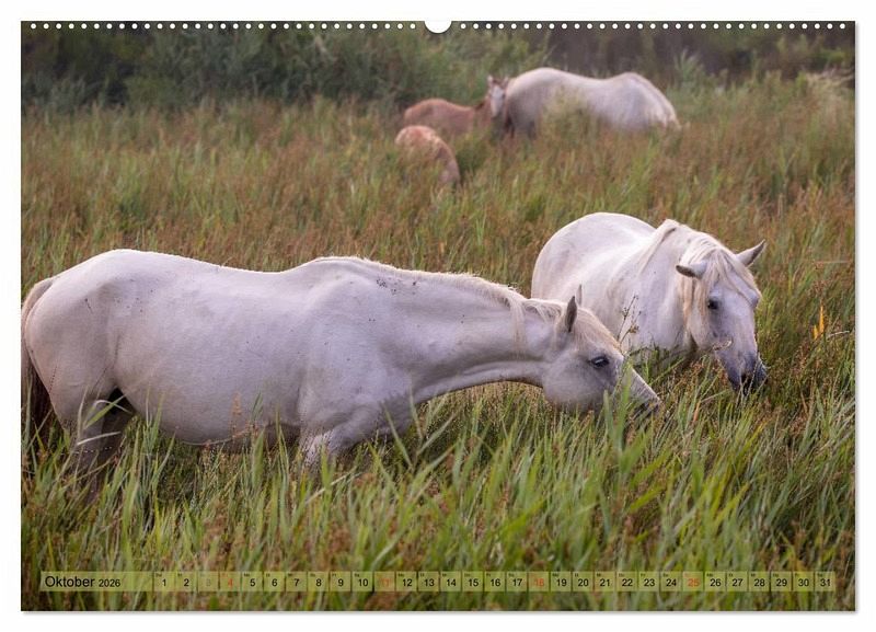 Oktober: Weiße, halbwilde Pferde der Camargue