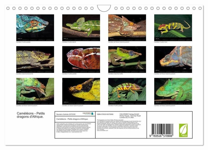 Les caméléons comptent parmi les reptiles les plus étranges et sont renommés pour leur capacité à changer de couleur, leurs yeux à mobilité indépendante et leur langue protactile. Environ 140 espèces évoluent dans la brousse Africaine et au coeur des forêts de Madagascar. Certains spécimens atteignant à peine la grosseur du pouce, alors que d'autres, comme le caméléon de Parson, mesurent jusqu'à soixante centimetres. Le photographe primé Chris Hellier présente, dans une douzaine de portraits, quelques unes des espèces les plus surprenantes et les plus colorées.