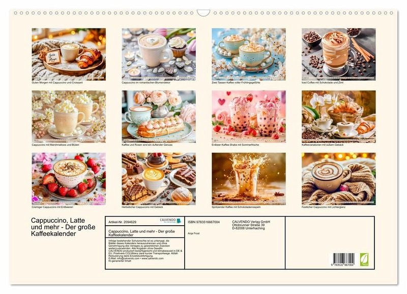 "Cappuccino, Latte und mehr - Der große Kaffeekalender" feiert die Vielfalt der Kaffeekultur. Zwölf stimmungsvolle KI-generierte Motive zeigen aromatische Kaffeespezialitäten in all ihren Facetten: cremiger Cappuccino, Latte Macchiato, kunstvolle Milchschaumkreationen, eiskalter Eiskaffee oder süße Variationen mit Schokolade und Marshmallows. Perfekt für alle, die Kaffee lieben und ihn als kleinen Glücksmoment im Alltag genießen möchten.