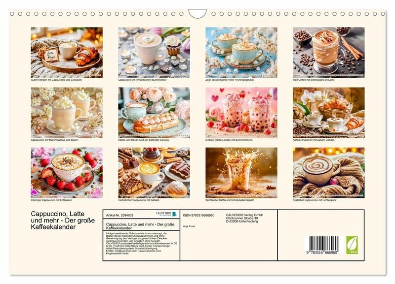 "Cappuccino, Latte und mehr - Der große Kaffeekalender" feiert die Vielfalt der Kaffeekultur. Zwölf stimmungsvolle KI-generierte Motive zeigen aromatische Kaffeespezialitäten in all ihren Facetten: cremiger Cappuccino, Latte Macchiato, kunstvolle Milchschaumkreationen, eiskalter Eiskaffee oder süße Variationen mit Schokolade und Marshmallows. Perfekt für alle, die Kaffee lieben und ihn als kleinen Glücksmoment im Alltag genießen möchten.