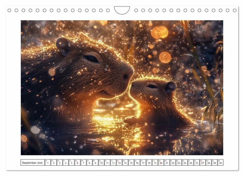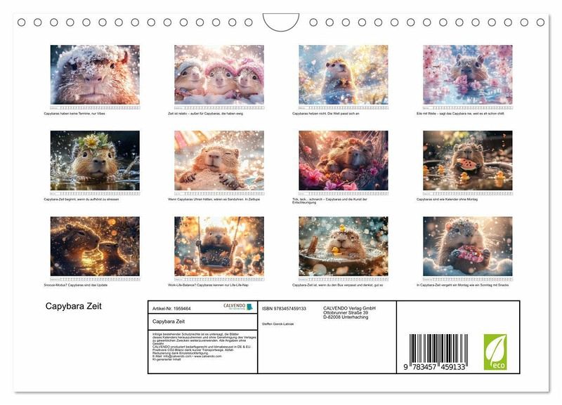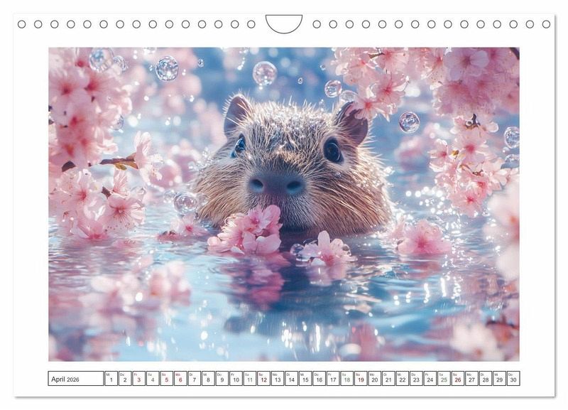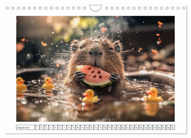 Mach's dir gemütlich, atme tief durch und lass die Welt einfach mal kurz weitermachen - ohne dich. In der Capybara-Zeit geht's nicht um Minuten oder Deadlines, sondern um flauschige Pausen, warme Sonnenstrahlen und das süße Gefühl, einfach nichts zu müssen. Ob du badest, döst oder einfach nur chillst, du bist genau richtig. Alle hier gezeigten Bilder wurden mit Sorgfalt, Liebe und mit Hilfe einer KI generiert. Abschließend werden sie mit Bildbearbeitungsprogrammen überarbeitet und in den Kalender eingefügt.