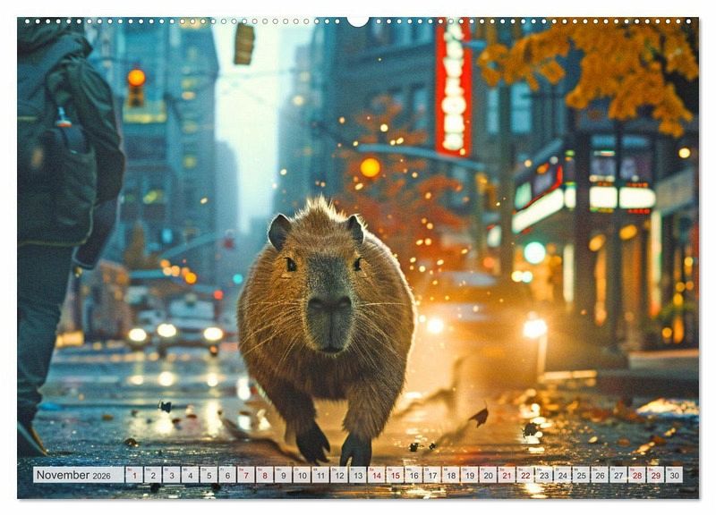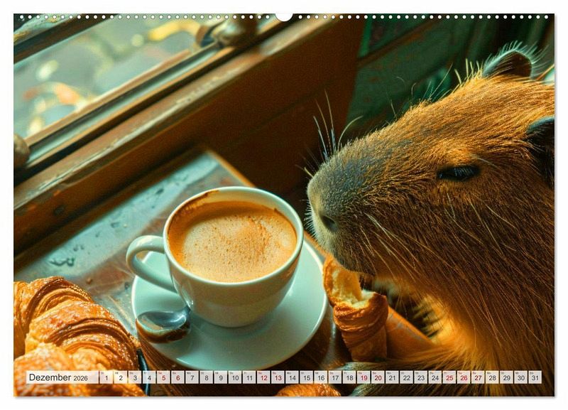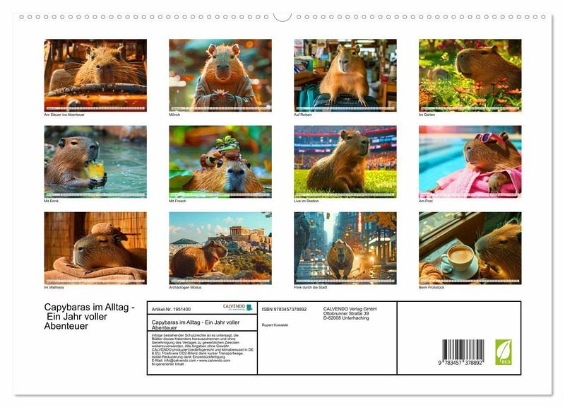 Entdecke das bezaubernde Leben der Capybaras und tauche ein in die wunderbare Welt der Capybaras. Jeden Monat gibt es eine neue, herzerwärmende KI-generierte Szene, in der die liebenswerten Tiere menschliche Alltagssituationen meistern. Ob beim Frühstück, im Büro oder im Urlaub - lass dich von den humorvollen und bezaubernden Momenten verzaubern, die dir jeden Tag ein Lächeln ins Gesicht zaubern. Perfekt für Tierliebhaber und alle, die das Besondere suchen. Hol dir dein Stück Glück nach Hause und erlebe ein Jahr voller Abenteuer mit den Capybaras.