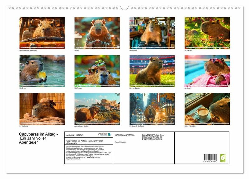 Entdecke das bezaubernde Leben der Capybaras und tauche ein in die wunderbare Welt der Capybaras. Jeden Monat gibt es eine neue, herzerwärmende KI-generierte Szene, in der die liebenswerten Tiere menschliche Alltagssituationen meistern. Ob beim Frühstück, im Büro oder im Urlaub - lass dich von den humorvollen und bezaubernden Momenten verzaubern, die dir jeden Tag ein Lächeln ins Gesicht zaubern. Perfekt für Tierliebhaber und alle, die das Besondere suchen. Hol dir dein Stück Glück nach Hause und erlebe ein Jahr voller Abenteuer mit den Capybaras.