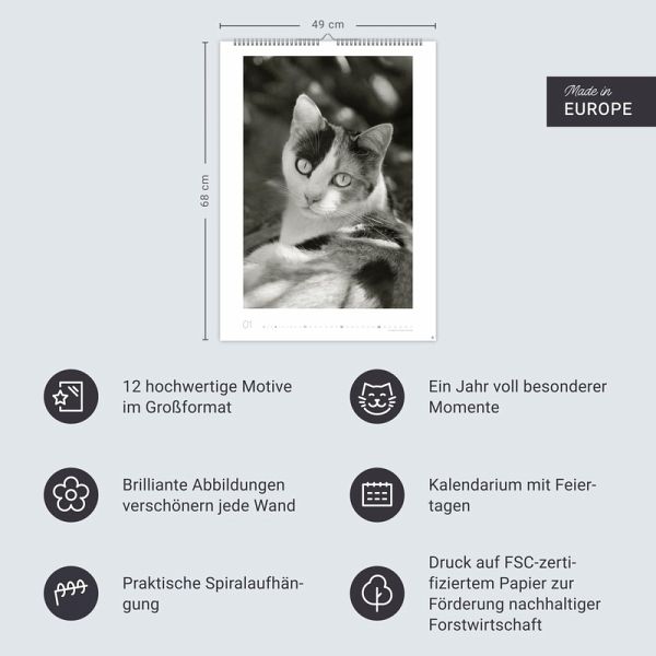 - Elegante Stubentiger in edlem Schwarz-Weiß: Der neue Monika Wegler-Katzenkalender 2026 ist da!- Samtpfoten deluxe: Monat für Monat hochwertige Katzenbilder und anspruchsvolle Tierfotografie in beeindruckender Qualität- Monika Weglers Fotokunst als besonderer Blickfang an jeder Wand: Kalender im großzügigen 68 x 49 cm-Format- Großer Wandkalender mit tierisch schönen Momenten: Immer das richtige Geschenk für Katzenliebhaber, die Wert auf das Besondere legen- Lebendige Vielfalt entdecken: Die Tierkalender von Heye aus dem Athesia Kalenderverlag