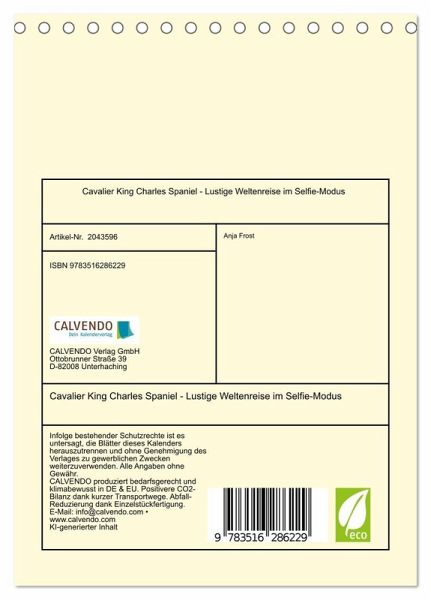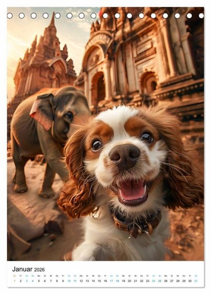 Entdecken Sie die entzückende Welt des Cavalier King Charles Spaniels auf seiner lustigen Weltenreise im Selfie-Modus! Von den majestätischen Ruinen von Machu Picchu in Südamerika bis zum romantischen Paris und einem herzerwärmenden Selfie mit neuen Kumpels, den Kängurus - dieser Kalender fängt die charmanten Abenteuer dieser bezaubernden Hunde auf einzigartige Weise ein. Tauchen Sie ein in die süße KI-generierte Welt des Cavalier King Charles und erleben Sie eine Reise voller Freude, Spaß und herzerwärmender Momente. Ein ideales Geschenk für Hundeliebhaber und die perfekte Begleitung für das kommende Jahr!