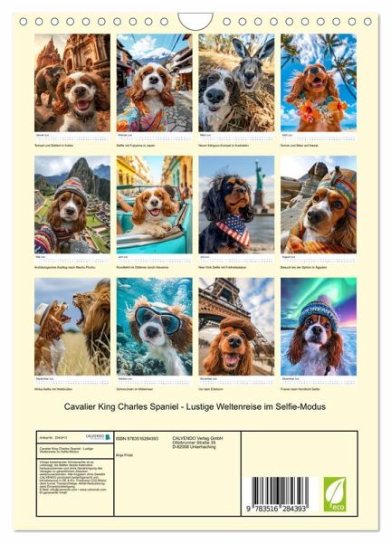 Entdecken Sie die entzückende Welt des Cavalier King Charles Spaniels auf seiner lustigen Weltenreise im Selfie-Modus! Von den majestätischen Ruinen von Machu Picchu in Südamerika bis zum romantischen Paris und einem herzerwärmenden Selfie mit neuen Kumpels, den Kängurus - dieser Kalender fängt die charmanten Abenteuer dieser bezaubernden Hunde auf einzigartige Weise ein. Tauchen Sie ein in die süße KI-generierte Welt des Cavalier King Charles und erleben Sie eine Reise voller Freude, Spaß und herzerwärmender Momente. Ein ideales Geschenk für Hundeliebhaber und die perfekte Begleitung für das kommende Jahr!