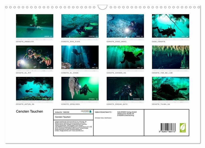 Das Cenoten Tauchen in Mexiko gehört zu den absoluten Highlights für Sporttaucher und Höhlentaucher. In diesem Kalender finden sie Monat für Monat Bilder von spektakulären Lichtvorhängen, Trennschichten aus Schwefel und Halokline (Süss-/Salzwasser) und sagenhaften Tropfstein Formationen finden sie in diesem Kalender alles was das Tauchen - alles was das Tauchen in den Cenoten in Mexiko für begeisterte Taucher so einzigartig macht.