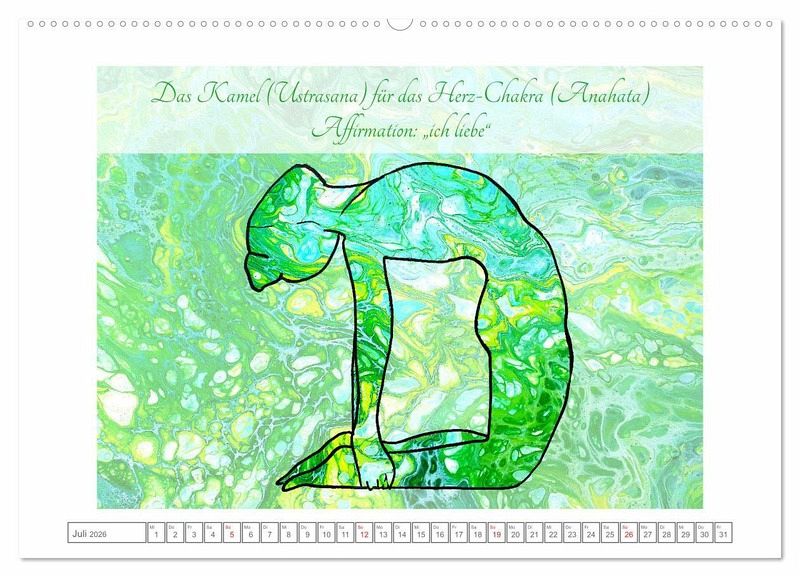 Künstlerische und farbenprächtige Darstellung spezieller Yoga Asanas in den leuchtenden Farben der sieben Hauptchakren. Die Übung und das dazu passende Chakra werden daneben in Sanskrit, einer der ältesten Sprachen der Welt, benannt. Eine passende Affirmation oder das zugeordnete Element runden die farbenfrohen Monatsseiten ab.