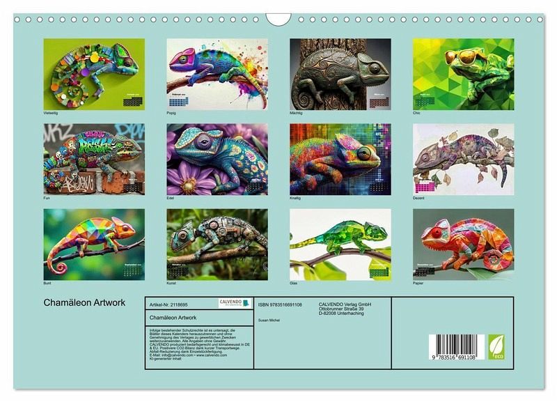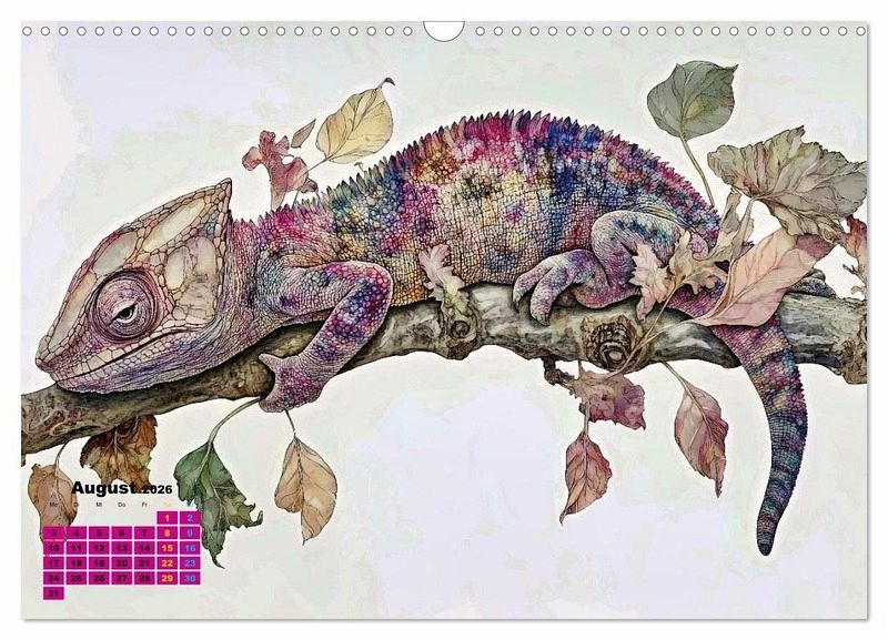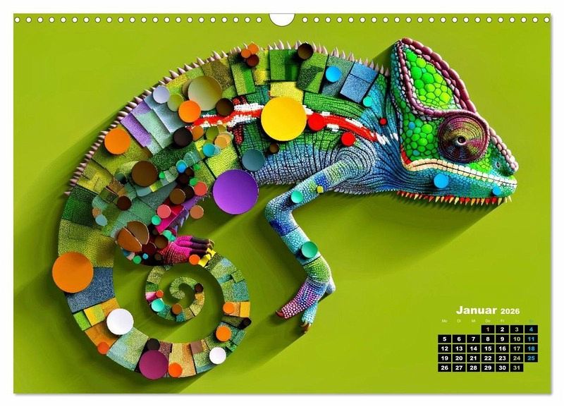 Ein Kalender, der mehr kann als nur die Monate zeigen - er bringt Kunst, Farbe und Inspiration in dein Zuhause. Wie ein Chamäleon sich seiner Umgebung anpasst, so verändert sich auch unsere Wahrnehmung jeden Monat. Dieser Kalender begleitet dich durch das Jahr mit einzigartigen Bildern, die überraschen, begeistern und zum Staunen einladen . Dieser Kalender wurde mit Unterstützung der KI erstellt.