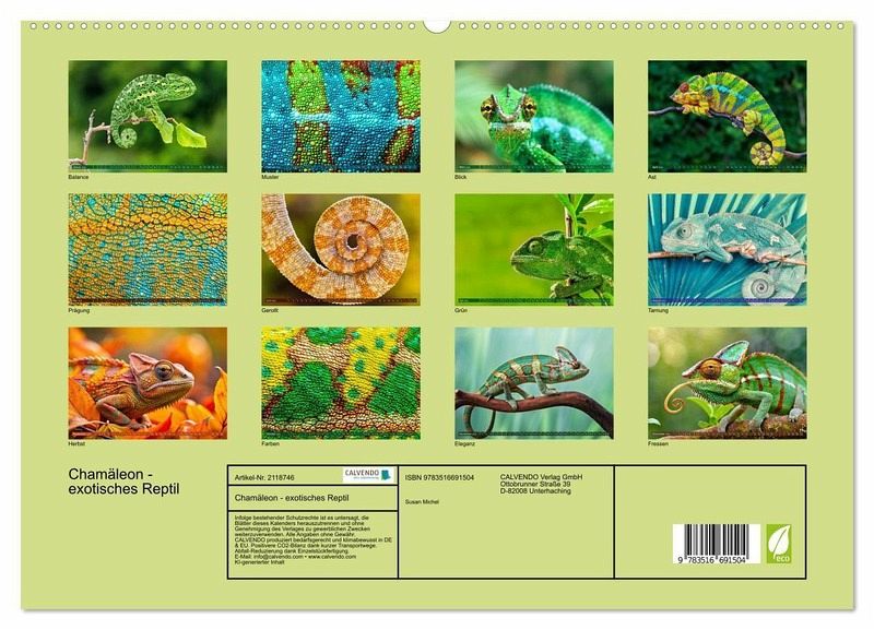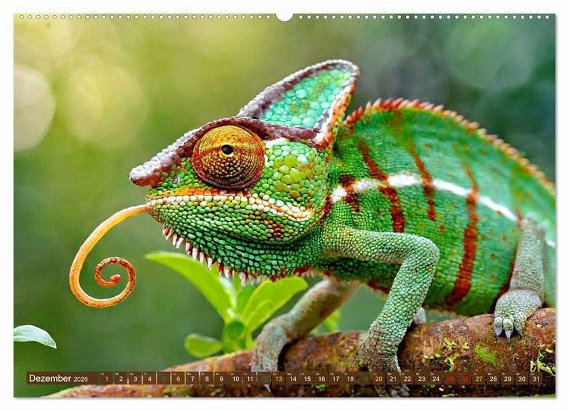 Kaum ein Tier verkörpert Wandel, Farbenpracht und Geheimnis so sehr wie das Chamäleon. Mit seiner faszinierenden Fähigkeit, die Farbe zu wechseln, und seiner einzigartigen Erscheinung gilt es als wahrer Meister der Anpassung. Ob in leuchtenden Grüntönen, dezenten Erdfarben oder überraschend bunten Mustern - jedes Kalenderblatt bringt dir die exotische Welt der Chamäleons ein Stück näher. Perfekt für alle Tierliebhaber, Naturfreunde und jene, die das Besondere suchen. Der Chamäleon-Kalender ist zudem ein ideales Geschenk, das 12 Monate lang Freude schenkt und immer wieder aufs Neue überrascht. Dieser Kalender wurde mit Unterstützung der KI erstellt.