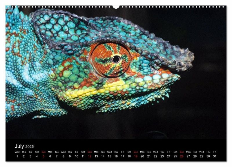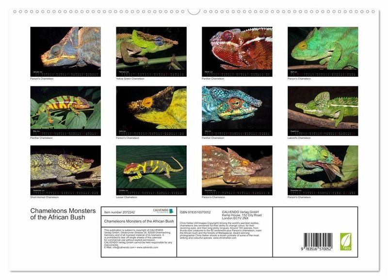 PREMIUM COLLECTION - Brilliant photo calendar with 12 beautiful motifs, high-gloss art print in museum quality.QUALITY - high-quality materials, sturdy back cover with 2 innovative insert pockets for optimum presentation on the wall.SUSTAINABLE - significant reduction in waste thanks to customised one-off production, environmentally friendly FSC-certified paper, production in Germany, climate-conscious logistics.PERFECT GIFT - calendars for friends and family,for children and adults, young and old, for Christmas, birthdays or in between.Striking Chameleon Portraits von Autor(in): Chris Hellier