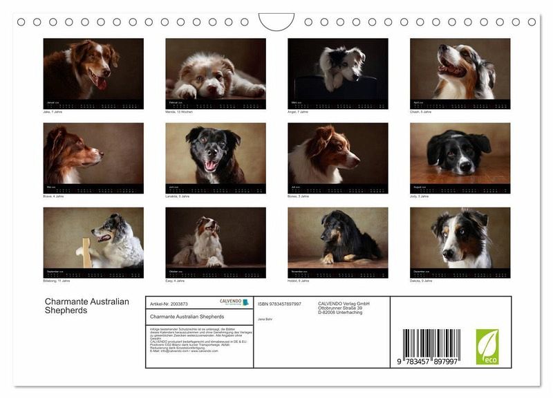 QUALITÄT - Hochwertiger Fotokalender mit 12 wunderschönen Motiven auf lichtbeständigem Bilderdruckpapier, robuste Spiralbindung mit Aufhängebügel.NACHHALTIG - deutliche Abfallreduzierung durch bedarfsgerechte Einzelstückfertigung, umweltfreundliches FSC-zertifiziertes Papier, Produktion in Deutschland, klimabewusste Logistik.PERFEKTES GESCHENK - Kalender für Freunde und Familie, für Kinder und Erwachsene, jung und alt, zu Weihnachten, Geburtstag oder zwischendurch.VIELFALT - Bildkalender in verschiedenen Formaten, z.B. DIN A5, DIN A4, DIN A3 sowie DIN A2. Ob Naturmotiv, Gemälde oder Fotos, ideal für ein persönliches Wohlfühlambiente.Australian Shepherds im Portrait von Autor(in): Jana Behr