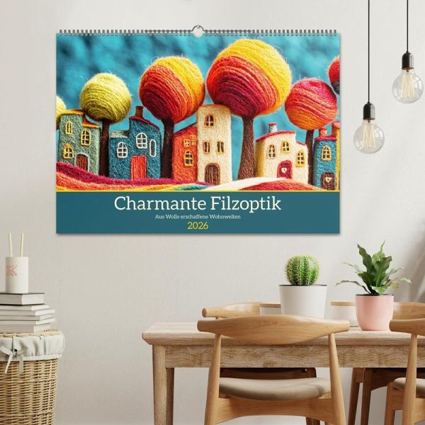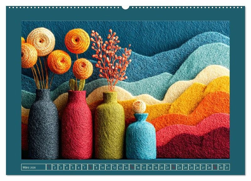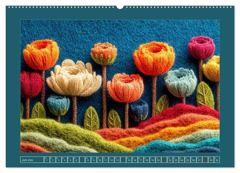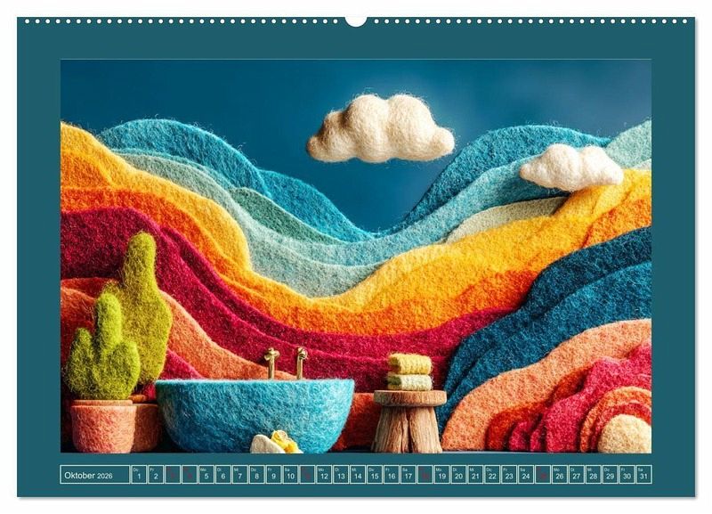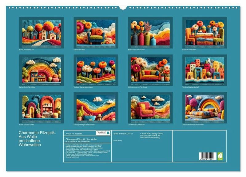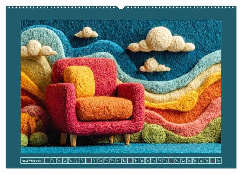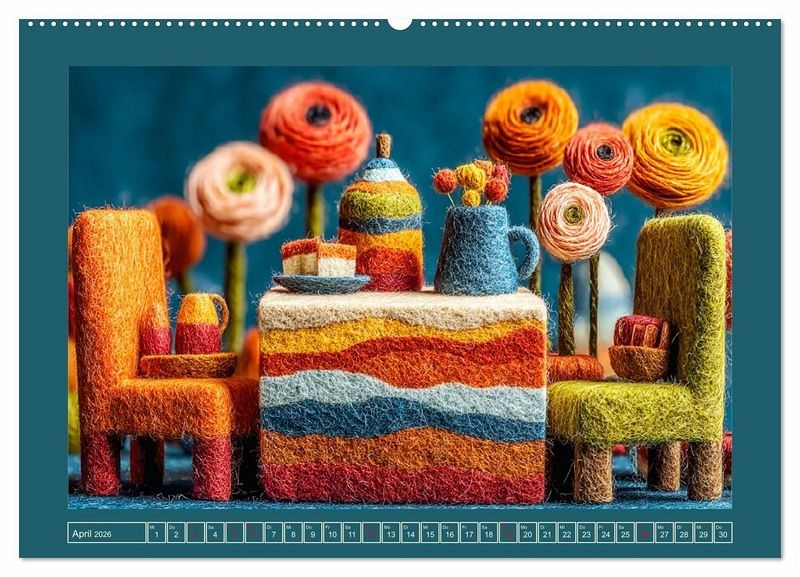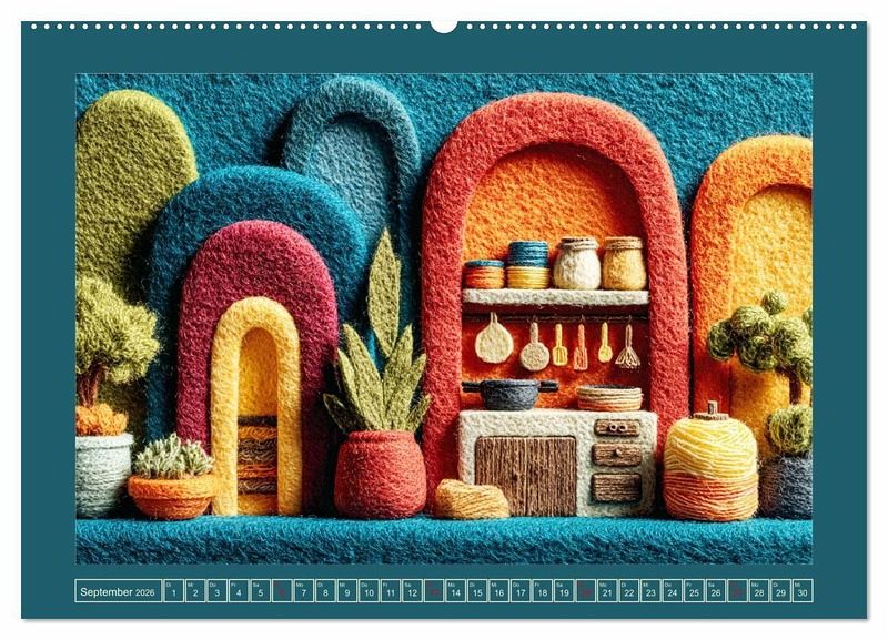 Tauche ein in eine Welt, in der jedes Möbelstück, jede Wand und selbst die Pflanzen aus sanfter, bunter Wolle bestehen. Die detailreichen Filzräume lassen den Alltag wie eine weiche Fantasie erscheinen - verspielt, kunstvoll und gemütlich zugleich. Jedes Bild erzählt eine eigene kleine Geschichte aus dem Leben in einer wolligen Traumwelt, voller Farbe und Fantasie. Alle Bilder wurden mit der Hilfe von KI erstellt sind ein dekoratives Stück Wärme für jeden Raum - Monat für Monat ein Hauch von Geborgenheit und Staunen.