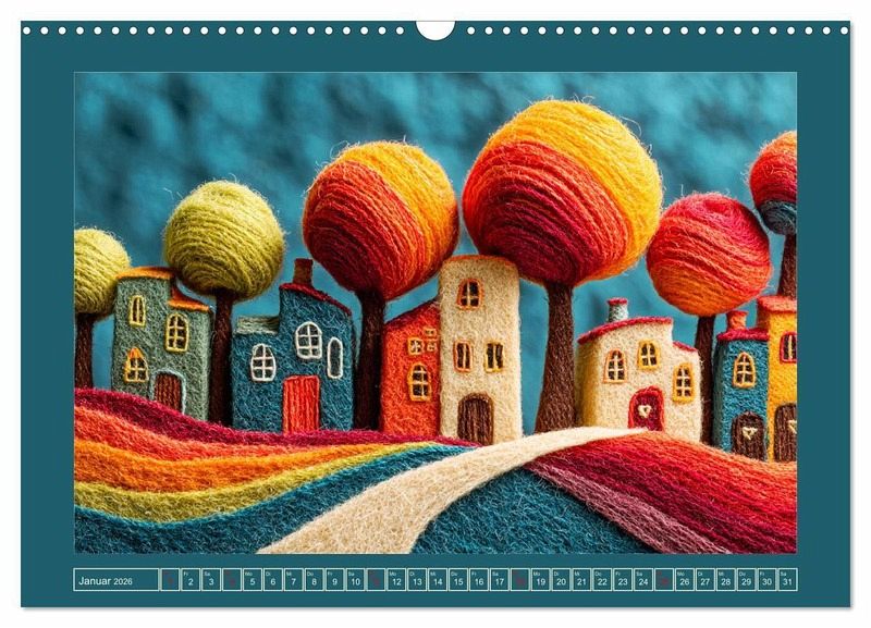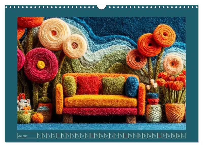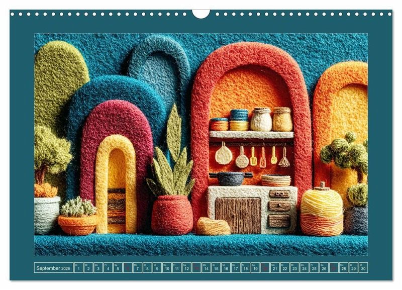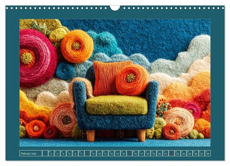 Tauche ein in eine Welt, in der jedes Möbelstück, jede Wand und selbst die Pflanzen aus sanfter, bunter Wolle bestehen. Die detailreichen Filzräume lassen den Alltag wie eine weiche Fantasie erscheinen - verspielt, kunstvoll und gemütlich zugleich. Jedes Bild erzählt eine eigene kleine Geschichte aus dem Leben in einer wolligen Traumwelt, voller Farbe und Fantasie. Alle Bilder wurden mit der Hilfe von KI erstellt sind ein dekoratives Stück Wärme für jeden Raum - Monat für Monat ein Hauch von Geborgenheit und Staunen.
