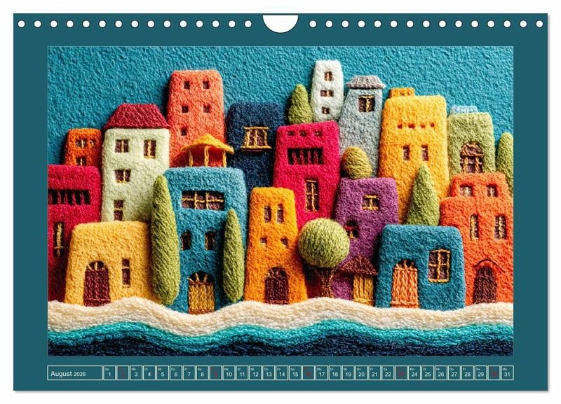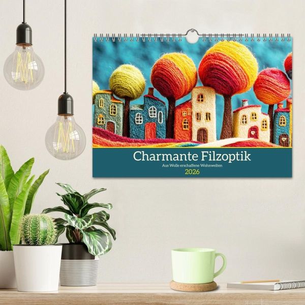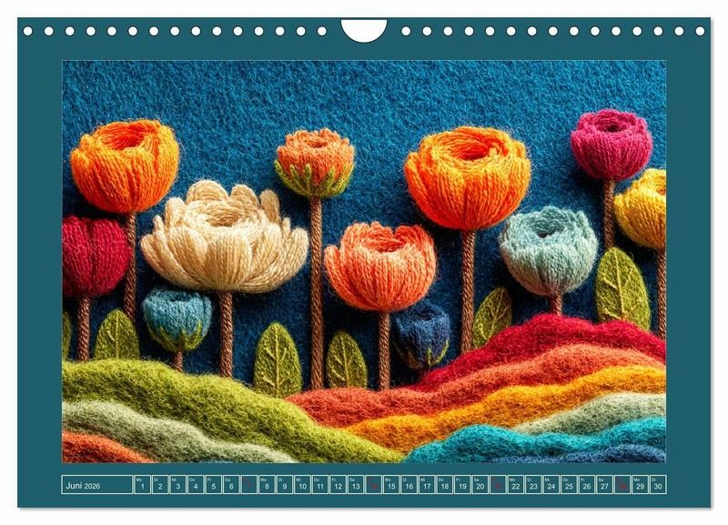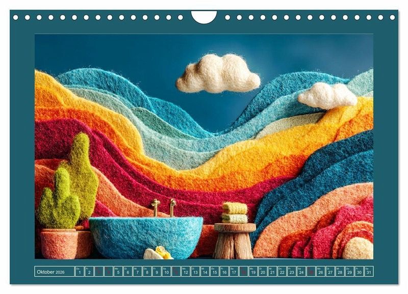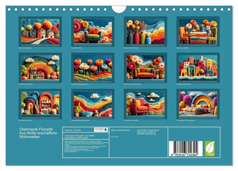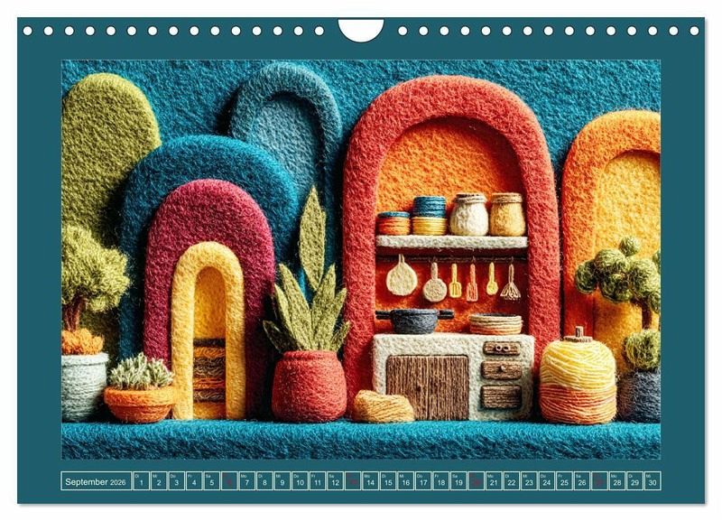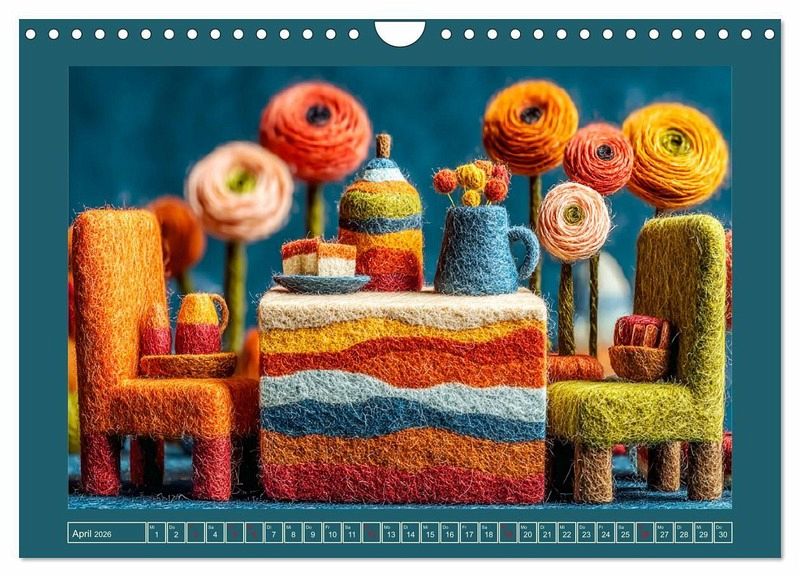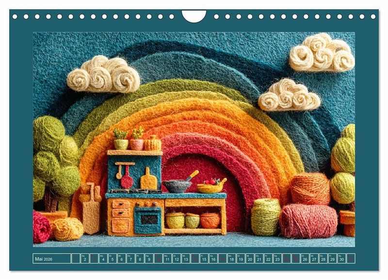 Tauche ein in eine Welt, in der jedes Möbelstück, jede Wand und selbst die Pflanzen aus sanfter, bunter Wolle bestehen. Die detailreichen Filzräume lassen den Alltag wie eine weiche Fantasie erscheinen - verspielt, kunstvoll und gemütlich zugleich. Jedes Bild erzählt eine eigene kleine Geschichte aus dem Leben in einer wolligen Traumwelt, voller Farbe und Fantasie. Alle Bilder wurden mit der Hilfe von KI erstellt sind ein dekoratives Stück Wärme für jeden Raum - Monat für Monat ein Hauch von Geborgenheit und Staunen.