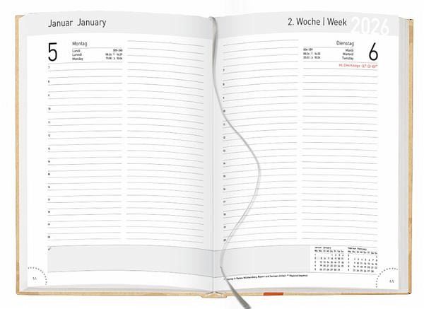 Buchkalender im Format: 14,5 x 20,5 cm, 352 Seiten, umweltfreundliches FSC Papier Pro Wochentag eine Seite, Samstag und Sonntag eine Seite Extras: Jahresübersicht 2026/27, Platz für Notizen, Infoseiten rund um geschäftliche Themen Kalendarium auf Deutsch, Englisch, Französisch und Italienisch; Feiertage für Deutschland, Österreich und SchweizLesebändchen sowie praktische Eckperforationen; Anzeige der Mondphasen sowie Aufgangs- und Untergangszeiten von Sonne und Mond