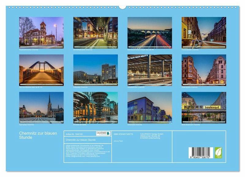 Tauche ein in die magische Atmosphäre von Chemnitz, festgehalten in einzigartigen Bildern zur blauen Stunde. Dieser Kalender präsentiert die Stadt von ihrer stimmungsvollsten Seite - ruhige Straßen, leuchtende Fassaden und ein Hauch von Abenddämmerung. Perfekt für alle, die Chemnitz lieben und die besondere Schönheit dieser Stadt jeden Monat genießen möchten. Sichere dir jetzt deinen Kalender und lass dich von faszinierenden Stadtansichten durch das Jahr begleiten!