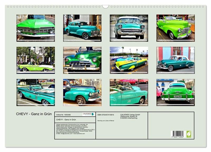 QUALITÄT - Hochwertiger Fotokalender mit 12 wunderschönen Motiven auf lichtbeständigem Bilderdruckpapier, robuste Spiralbindung mit Aufhängebügel.NACHHALTIG - deutliche Abfallreduzierung durch bedarfsgerechte Einzelstückfertigung, umweltfreundliches FSC-zertifiziertes Papier, Produktion in Deutschland, klimabewusste Logistik.PERFEKTES GESCHENK - Kalender für Freunde und Familie, für Kinder und Erwachsene, jung und alt, zu Weihnachten, Geburtstag oder zwischendurch.VIELFALT - Bildkalender in verschiedenen Formaten, z.B. DIN A5, DIN A4, DIN A3 sowie DIN A2. Ob Naturmotiv, Gemälde oder Fotos, ideal für ein persönliches Wohlfühlambiente.Verschiedene Chevrolet-Modelle in Grün in Kuba von Autor(in): Henning von Loewis of Menar