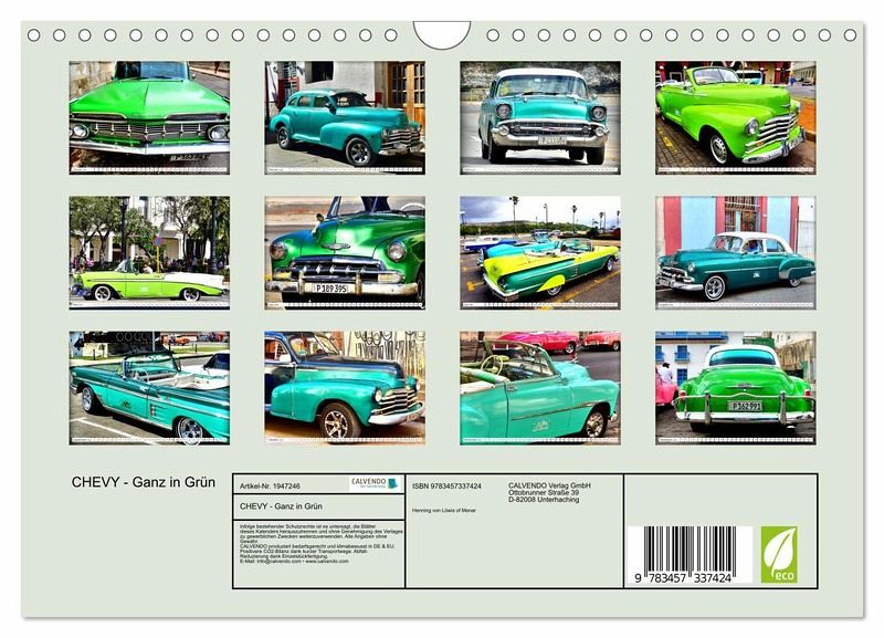 QUALITÄT - Hochwertiger Fotokalender mit 12 wunderschönen Motiven auf lichtbeständigem Bilderdruckpapier, robuste Spiralbindung mit Aufhängebügel.NACHHALTIG - deutliche Abfallreduzierung durch bedarfsgerechte Einzelstückfertigung, umweltfreundliches FSC-zertifiziertes Papier, Produktion in Deutschland, klimabewusste Logistik.PERFEKTES GESCHENK - Kalender für Freunde und Familie, für Kinder und Erwachsene, jung und alt, zu Weihnachten, Geburtstag oder zwischendurch.VIELFALT - Bildkalender in verschiedenen Formaten, z.B. DIN A5, DIN A4, DIN A3 sowie DIN A2. Ob Naturmotiv, Gemälde oder Fotos, ideal für ein persönliches Wohlfühlambiente.Verschiedene Chevrolet-Modelle in Grün in Kuba von Autor(in): Henning von Loewis of Menar
