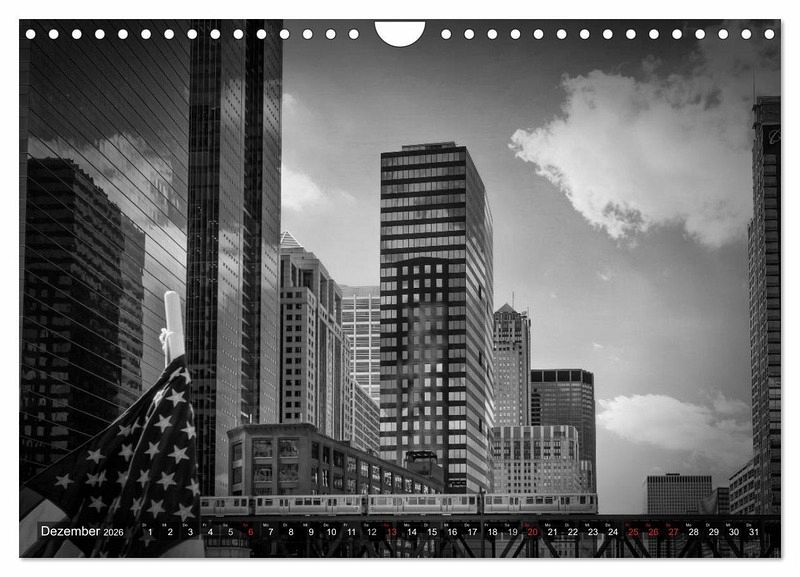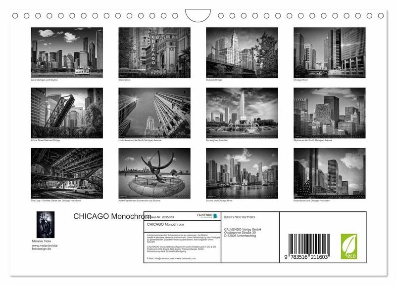 Chicago befindet sich sehr idyllisch gelegen am Lake Michigan. Die Stadt bietet eine große Vielfalt an Sehenswürdigkeiten. Viele neue und alte Wolkenkratzer bilden das Zentrum der Stadt. Die Hochbahngleise der EL sind das Herzstück des als Loop bekannten Innenstadtrings. In diesem Kalender finden Sie 12 ansprechende monochrome Ansichten aus der US-Metropole.