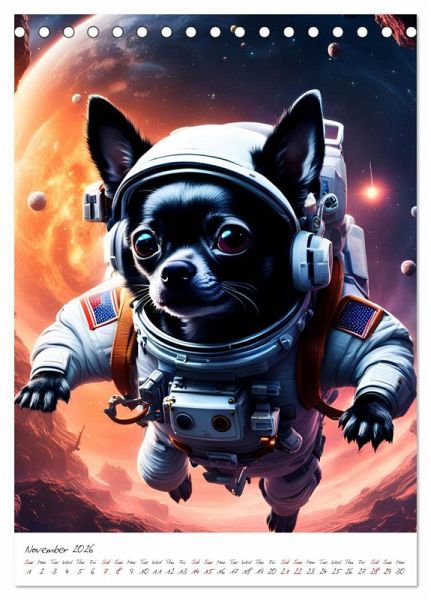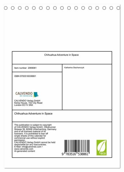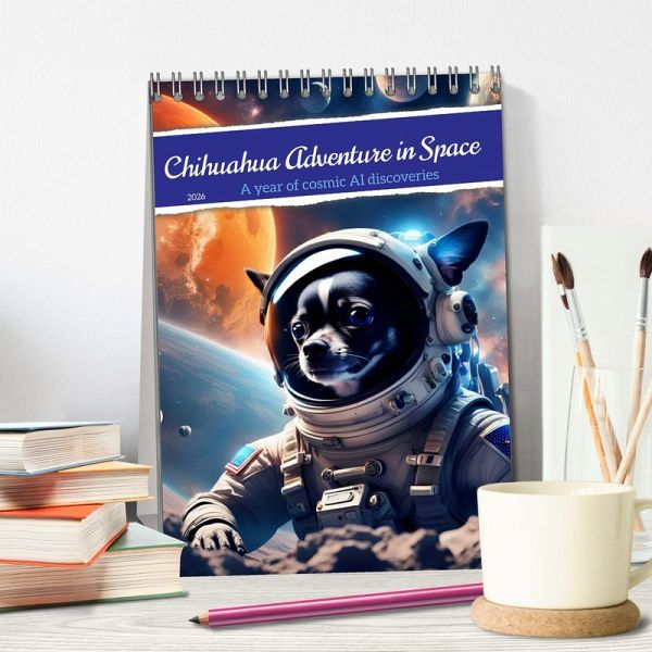 QUALITY - High-quality photo calendar with 12 beautiful images on light-resistant paper, robust spiral binding.SUSTAINABLE - Significant waste reduction due to print-on-demand production, environmentally friendly FSC-certified paper, produced locally, climate-conscious logistical processes.PERFECT GIFT - calendars for friends and family, for children, all ages and all occasions, from Christmas to birthdays and everything in between.LOTS OF CHOICE - Wall calendars in different sizes (DIN A4 and DIN A3), for any topic and personal taste, featuring photography, painting and illustrations.Cute AI Chihuahua astronaut explores space von Autor(in): Katharina Stachanczyk