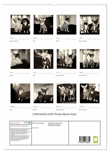 PREMIUM-LINIE - Brillanter Fotokalender mit 12 wunderschönen Motiven, Kunstdruck in Hochglanz in Museumsqualität.QUALITÄT - edle Materialien, stabile Rückwand mit 2 innovativen Einstecktaschen für eine optimale Präsentation an der Wand.NACHHALTIG - deutliche Abfallreduzierung durch bedarfsgerechte Einzelstückfertigung, umweltfreundliches FSC-zertifiziertes Papier, Produktion in Deutschland, klimabewusste Logistik.PERFEKTES GESCHENK - Kalender für Freunde und Familie, für Kinder und Erwachsene, jung und alt, zu Weihnachten, Geburtstag oder zwischendurch.Die CHIHUAHUA Geschwister Maya und Brownie werden gerne chic angezogen von Autor(in): Marion Koell