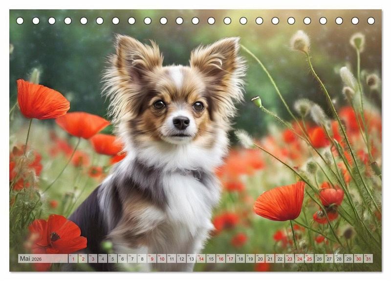 Mai: Ein braun-weißer Chihuahua sitzt in einem Mohnblumenfeld