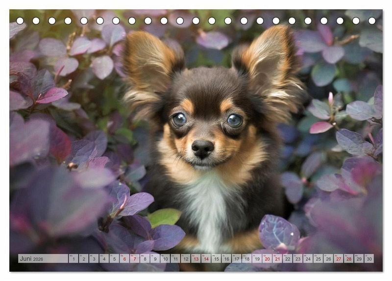 Juni: Ein kleiner dunkelbrauner Chihuahua schaut durch aubergine farbene Blätter