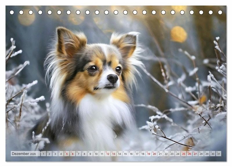 Dezember: Ein Langhaar Chihuahua sitzt zwischen gefrorenen Sträuchern