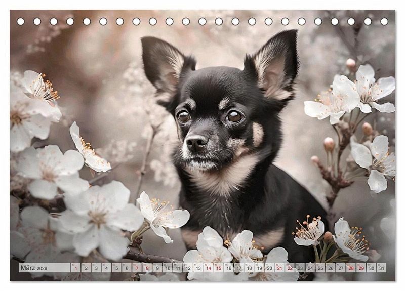März: Ein schwarzer Chihuahua blickt durch weiße Kirschblüten