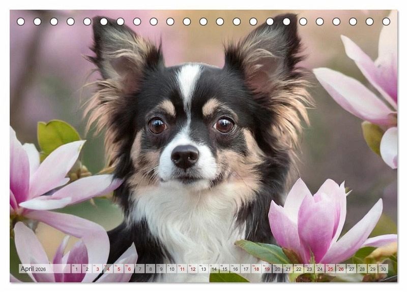 April: Portrait eines schwarz-weißen Chihuahua der durch Magnolien schaut
