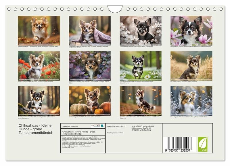 Der kleinste Hund der Welt ist ganz groß in den Herzen der Hundeliebhaber verankert. Und wie unternehmenslustig diese Hunde sind, sieht man auf diesen inspirierenden, durch KI erstellten Bildern. Die Bilder spiegeln die Persönlichkeit dieser charmanten Hunderasse, deren lustiges und fröhliches Wesen wieder. Ein wunderbarer Wandschmuck fürs ganze Jahr.