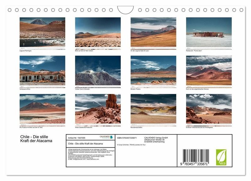 QUALITÄT - Hochwertiger Fotokalender mit 12 wunderschönen Motiven auf lichtbeständigem Bilderdruckpapier, robuste Spiralbindung mit Aufhängebügel.NACHHALTIG - deutliche Abfallreduzierung durch bedarfsgerechte Einzelstückfertigung, umweltfreundliches FSC-zertifiziertes Papier, Produktion in Deutschland, klimabewusste Logistik.PERFEKTES GESCHENK - Kalender für Freunde und Familie, für Kinder und Erwachsene, jung und alt, zu Weihnachten, Geburtstag oder zwischendurch.VIELFALT - Bildkalender in verschiedenen Formaten, z.B. DIN A5, DIN A4, DIN A3 sowie DIN A2. Ob Naturmotiv, Gemälde oder Fotos, ideal für ein persönliches Wohlfühlambiente.Inspirierende Momente aus der Stille: Die Atacama-Wüste im Fokus von Autor(in): Sonja Schlichter