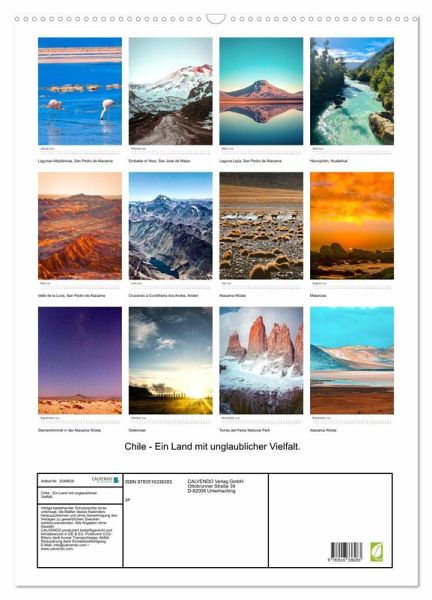 Chile ist ein unbeschreiblich schönes und einzigartiges Land. Mit den Anden, der Atacama Wüste und dem Torres del Paine Nationalpark bietet Chile eine unglaubliche Vielfalt die man selten wo anders vorfindet. Mit diesem Kalender können Sie jeden Monat eine weitere tolle Facette des wunderschönen Landes entdecken.