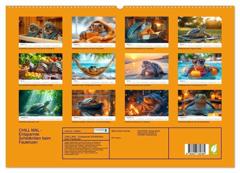 PREMIUM-LINIE - Brillanter Fotokalender mit 12 wunderschönen Motiven, Kunstdruck in Hochglanz in Museumsqualität.QUALITÄT - edle Materialien, stabile Rückwand mit 2 innovativen Einstecktaschen für eine optimale Präsentation an der Wand.NACHHALTIG - deutliche Abfallreduzierung durch bedarfsgerechte Einzelstückfertigung, umweltfreundliches FSC-zertifiziertes Papier, Produktion in Deutschland, klimabewusste Logistik.PERFEKTES GESCHENK - Kalender für Freunde und Familie, für Kinder und Erwachsene, jung und alt, zu Weihnachten, Geburtstag oder zwischendurch.Entspanne mit coolen Schildkröten durch das Jahr. Jede Szene zeigt sie in lustigen, gelassenen Momenten, perfekt für Fans von Ruhe und Entschleunigung von Autor(in): Michael Bihlmayer