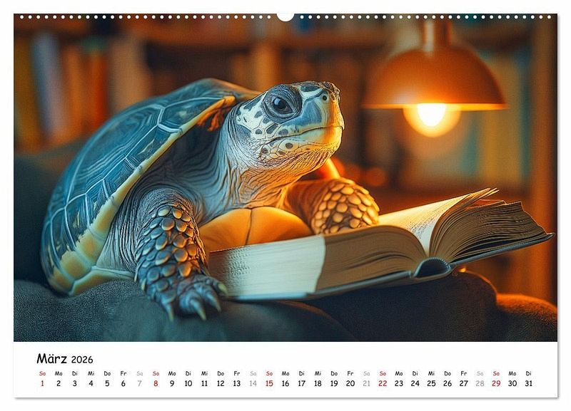 März: Schildkröte liest gemütlich bei Lampenlicht