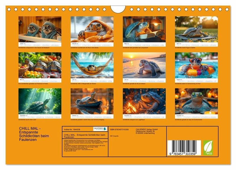 Entschleunige deinen Alltag mit diesem einzigartigen Schildkröten-Kalender, ideal für Büro oder Zuhause. Jede Seite zeigt coole Schildkröten in entspannten Szenen, die zum Chillen und Faulenzen einladen. Ob du deine Kollegen zum Schmunzeln bringst oder während der Arbeit eine kleine Auszeit suchst - dieser Kalender bringt Entspannung in deinen Tag. Die liebevoll gestalteten Fotos, mit Hilfe von KI erstellt, versprühen Ruhe und Gelassenheit. Perfekt für alle, die Entschleunigung und Erholung suchen. Dieser Schildkrötenkalender ist ideal, um mehr Entspannung in dein Büro zu bringen und eine ruhige Arbeitsatmosphäre zu schaffen.